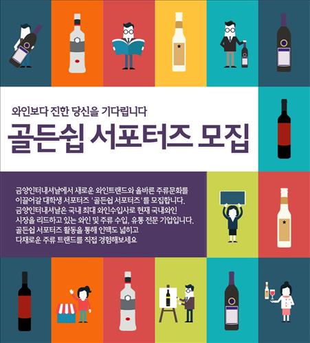 (서울=연합뉴스) 고유선 기자 = 와인수입사 금양인터내셔날은 올바른 주류 문화를 이끌어가기 위해 대학생 홍보마케터인 '골든쉽 서포터즈'를 모집한다고 12일 밝혔다.