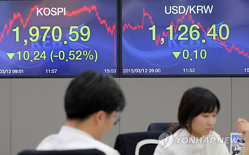 | △ 코스피 나흘째 하락 (서울=연합뉴스) 이정훈 기자 = 코스피는 12일 한국은행의 기준금리 인하 결정에도 하락으로 마감했다. 이날 코스피는 전날보다 10.24포인트(0.52%) 내린 1,970.59, 원·달러 환율은 0.1원 내린 1,126.4원으로 마감했다. 사진은 이날 서울 명동 외환은행 본점 딜링룸. |