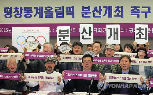| △ '정부는 평창동계올림픽 분산개최 불가 방침 재검토 하라!' (서울=연합뉴스) 이정훈 기자 = '평창동계올림픽분산개최를촉구하는시민모임' 관계자들이 12일 오전 서울 중구 세종대로 한국프레스센터에서 기자회견을 열고 정부의 분산개최 불가 방침을 원점에서 재검토하고 논의를 다시 시작할 것을 촉구하고 있다. 2015.3.12 uwg806@yna.co.kr |