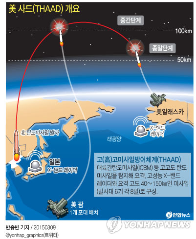 | △ <그래픽> 美 사드(THAAD) 개요 (서울=연합뉴스) 반종빈 기자 = 청와대와 정부, 새누리당이 오는 15일 정책조정협의회 회의를 개최한다. 이번 회의에선 마크 리퍼트 주한 미국 대사의 흉기 피습 사건을 계기로 탄력을 받게 된 테러 방지 관련 법안의 추진이 주요 의제가 될 예정이며 미국의 고(高)고도 미사일방어체계인 '사드(THAAD)' 도입 문제도 함께 논의될 것으로 전망된다. bjbin@yna.co.kr 페이스북 tuney.kr/LeYN1 트위터 @yonhap_graphics |