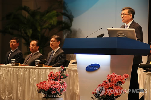 | △ 삼성전자 정기 주주총회 (서울=연합뉴스) 박지호 기자 = 13일 오전 서울 삼성전자 서초사옥에서 열린 삼성전자 정기 주주총회에서 권오현 의장(삼성전자 부회장)이 인사말을 하고 있다. |