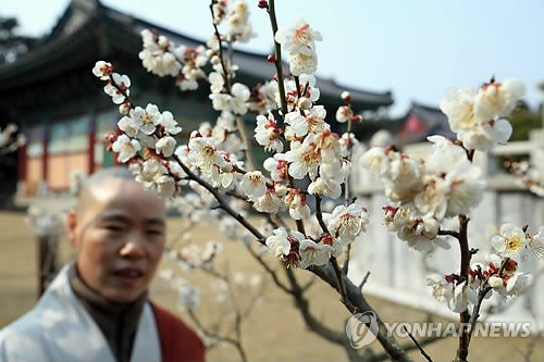 | △ (제주=연합뉴스) 고성식 기자 = 매화로 유명한 제주시 오라동 월정사 앞마당에서 13일 좌선 수행에 몰두하던 비구니가 활짝 핀 매화를 바라보며 따뜻한 봄을 느끼고 있다. 2015.3.13. koss@yna.co.kr |