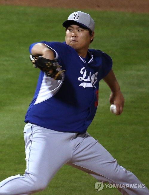 | △ 변함없이 괴물 (피오리아<미국 애리조나>=연합뉴스) 황광모 기자 = 13일(한국시간) 미국 애리조나 피오리아 스포츠 콤플렉스에서 열린 미국 메이저리그 시범경기 LA 다저스와 샌디에이고 파드리스의 경기에서 LA 선발 류현진이 2회말 힘차게 투구하고 있다. 2015.3.13 hkmpooh@yna.co.kr |