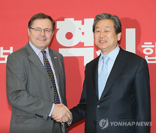 (서울=연합뉴스) 류미나 기자 = 새누리당 김무성 대표는 13일 오전 국회에서 찰스 존 헤이 신임 주한 영국대사와 클레어 펀리 신임 주한 뉴질랜드 대사를 연달아 접견했다.