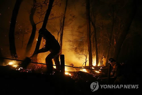 | △ 불암산 산불 진화하는 소방관 (서울=연합뉴스) 김주성 기자 = 14일 새벽 서울 노원구 불암산에서 소방관들이 진화작업을 벌이고 있다. 전날 오후 10시 59분께 불암산 중턱 학도암 부근에서 발생한 화재는 정상 방향으로 옮겨 붙고 있어 소방 당국은 장비 20여대와 인원 100여명을 동원해 진화 중이다. 2015.3.14 utzza@yna.co.kr |