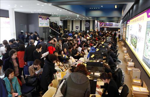 | △ 정부의 금리 인하 발표로 새 아파트 분양시장에도 청약인파가 몰리고 있다. 사진은 지난 13일 문을 열어 주말까지 사흘간 3만7천명이 몰린 화성 동탄2신도시 '동탄역 반도유보라 아이비파크 5.0, 6.0'의 모델하우스 집객 모습. (사진 반도건설 제공) |