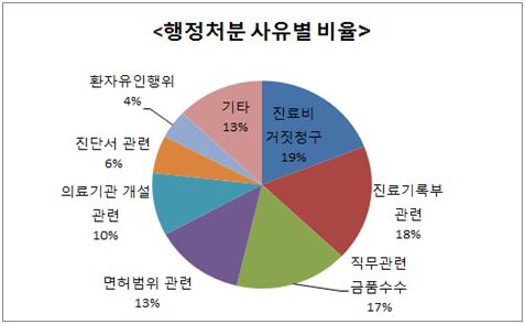 사유별로는 전체 행정처분의 약 19%가 진료비 거짓청구 때문이었다. 행정처분을 받은 의사 5명중 1명꼴이다.