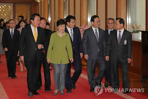| △ 신임 비서실장·정무특보단과 이동하는 박 대통령 (서울=연합뉴스) 이정훈 기자 = 박근혜 대통령이 16일 오후 청와대 충무실에서 임명장·위촉장 수여식을 마친 뒤 비서실장, 특별보좌관, 수석비서관들과 함께 퇴장하고 있다. 오른쪽 부터 이병기 비서실장, 이근면 인사혁신처장, 주호영 정무특보, 윤상현 정무특보, 박 대통령, 김재원 정무특보, 김경재 홍보특보. |