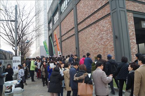 | △ 지난 16일 마포 한강2차 푸르지오 오피스텔 모델하우스에는 청약접수를 하려는 투자자들이 몰리며 평균 13.7대 의 경쟁률로 마감됐다. (사진 대우건설 제공) |
