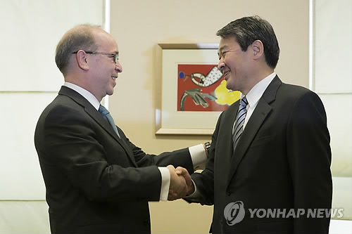 | △ 외교부 방문한 대니얼 러셀 미 국무부 차관보 (서울=연합뉴스) 전수영 기자 = 대니얼 러셀(왼쪽) 미국 국무부 차관보가 17일 서울 세종로 정부서울청사에서 조태용 외교부 차관과 만나 인사하고 있다. |