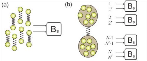 | △ 양자 순간이동에 필요한 측정 방법의 비교 (a) 얽혀 있는 광자 쌍 가운데 하나를 양자 순간이동시키는 기존의 방법 (b) 한꺼번에 얽혀있는 광자들을 다량 만들 다음 얽힌 상태의 광자 여러 개를 묶어 양자 순간이동시키는 새로운 방법 |