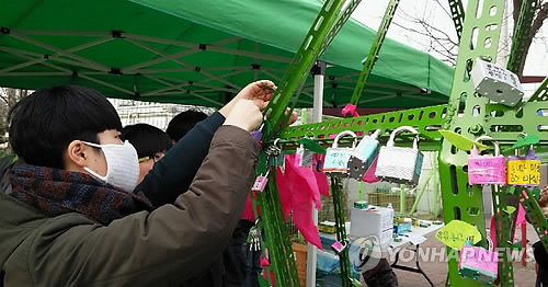 | △ '해고자 복직' 기원 (평택=연합뉴스) 쌍용자동차 범국민대책위원회 소속 회원 등이 14일 오후 경기도 평택시 칠괴동 쌍용자동차 평택공장 앞에서 '3.14 희망행동' 문화제를 열고 사측에 해고자 복직 등 문제 해결을 촉구했다. 한 시민이 이를 염원하며 철조망에 자물쇠를 걸고 있다. 2015.3.14. <<쌍용차 범대위 제공>> you@yna.co.kr |
