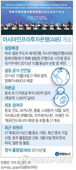 | △ <그래픽> 아시아인프라투자은행(AIIB) 개요 (서울=연합뉴스) 반종빈 기자 = 방한 중인 류젠차오(劉建超) 중국 외교부 부장조리(차관보급)는 16일 한국의 아시아인프라투자은행(AIIB) 가입 문제와 관련, "AIIB의 추진 현황에 대해 설명했고 한국측이 AIIB의 창설멤버가 되길 희망한다는 입장을 다시 한번 표명했다"고 밝혔다. bjbin@yna.co.kr 페이스북 tuney.kr/LeYN1 트위터 @yonhap_graphics |
