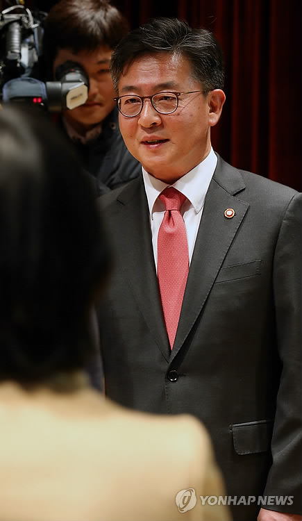 | △ 홍용표 통일부장관 취임 (서울=연합뉴스) 전수영 기자 = 홍용표 통일부 장관이 16일 오전 서울 도렴동 정부서울청사별관에서 열린 취임식에서 직원들과 인사하고 있다. 2015.3.16 swimer@yna.co.kr |