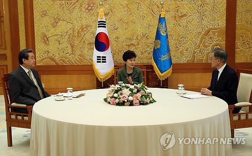 | △ 대화하는 박 대통령과 여야 대표 (서울=연합뉴스) 도광환 기자 = 박근혜 대통령과 새누리당 김무성 대표, 새정치민주연합 문재인 대표가 17일 오후 청와대에서 열린 여야대표 회동에서 대화하고 있다. |