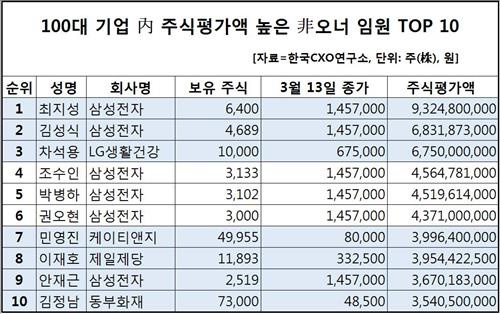 18일 기업분석 전문업체 한국CXO연구소(소장 오일선)가 국내 100대 기업 사업보고서를 토대로 전문경영인 임원들의 주식평가액을 분석한 자료에 따르면, 최 부회장은 삼성전자[005930] 보통주 6천400주를 보유한 것으로 집계됐다.