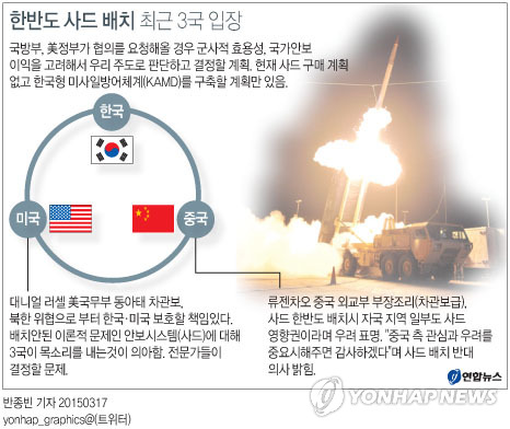 | △ <그래픽> 한반도 사드 배치 최근 3국 입장 (서울=연합뉴스) 반종빈 기자 = 미국의 고고도 미사일방어체계인 사드(THAAD)의 주한미군 배치 문제가 한미중 3국 간의 안보 이슈를 뛰어넘어 심각한 갈등 양상으로까지 번지는 모양새가 되고 있다. bjbin@yna.co.kr 페이스북 tuney.kr/LeYN1 트위터 @yonhap_graphics |