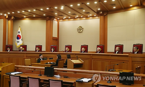 | △ 박한철 헌법재판소장을 비롯한 헌법재판관들이 간통죄 위헌 여부 선고를 위해 지난달 26일 오후 서울 종로구 재동 헌법재판소 대심판정으로 들어선 뒤 자리에 앉아 있다. 헌재는 이날 간통을 처벌하도록 한 형법 제241조가 위헌이라고 선고했다. |