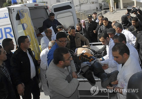 | △ (AP=연합뉴스) 18일(현지시간) 튀니지 수도 튀니스의 박물관 총격 테러 사건으로 부상을 입은 경찰관 1명이 들것에 실려 병원으로 옮겨지고 있다. |