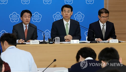 | △ '제조업 혁신 3.0 전략 실행대책' 관계부처 합동 브리핑 (세종=연합뉴스) 배재만 기자 = 박청원 산업통상자원부 산업정책실장(왼쪽)이 18일 오전 정부세종청사 제1공용브리핑룸에서 제7차 무역투자진흥회의에서 확정 발표될 '제조업 혁신 3.0 전략 실행대책'에 대해 사전 브리핑하고 있다. 오른쪽은 정종제 국민안전처 기획조정실장, 가운데는 정은보 기획재정부 차관보. |