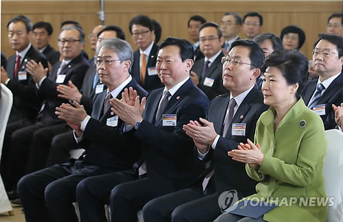 | △ (부산=연합뉴스) 도광환 기자 = 박근혜 대통령이 16일 오전 부산 벡스코에서 열린 부산창조경제혁신센터 출범식에 참석, 조홍근 센터장, 신동빈 롯데그룹 회장, 임종룡 금융위원장 등과 함께 박수치고 있다. 2015.3.16 dohh@yna.co.kr |
