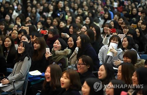 | △ 지난 2월 27일 오전 서울 서대문구 이화여대 대강당에서 열린 2015학년도 입학식에서 신입생들이 남성교수 중창단의 축가에 환하게 웃고 있다. |