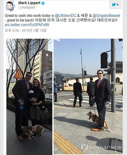 리퍼트 대사는 이날 자신의 트위터 계정에 글을 올려 "오늘 (아내) 로빈과 (아들) 세준, (애견) 그릭스비와 걸어서 출근해 굉장히 좋았다"며 "복귀해서 정말 좋다"고 밝혔다.