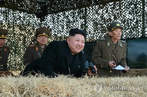 | △ 북한 김정은 국방위원회 제1위원장이 망원경을 들고 군 간부를 거느린 채 공군의 비행장 타격·복구 훈련을 참관하는 모습을 노동신문이 20일 보도했다. 2015.3.20.<<연합뉴스DB>> |