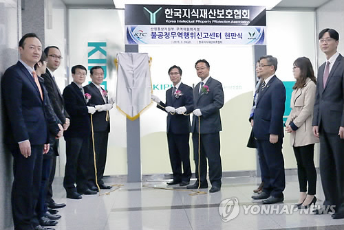 | △ 한국지식재산보호협회 현판 제막식 (서울=연합뉴스) 20일 오후 서울 강남구 한국지식재산센터 지식재산보호협회 회의실에서 열린 '한국지식재산보호협회 신고센터 지정서 수여 및 현판 제막식'에서 박진규 산업통상자원부 무역조사실장 등 참석자들이 제막 전 기념 촬영을 하고 있다. (산업통상자원부 제공) |