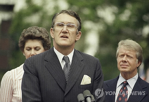 | △ 호주가 영국 식민지에서 다문화 사회로 탈바꿈하는 데 큰 역할을 한 맬컴 프레이저 전 호주 총리가 20일 향젼 84세로 타계했다. 사진은 1977년 미국 백악관에서 지미 카터 대통령과 만난 뒤 연설하는 모습. 2015.3.20 (AP=연합뉴스 자료사진) |