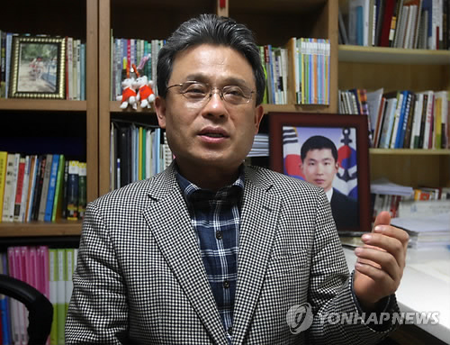 | △ 심정 밝히는 고(故) 박석원 상사 부친 박병규씨 (아산=연합뉴스) 한종구 기자 = 북한의 천안함 어뢰 공격으로 아들(박석원 상사)을 잃은 박병규(59) 천안함46용사유족협의회장이 21일 충남 아산시 자택에서 가진 연합뉴스와의 인터뷰에서 담담하게 심정을 밝히고 있다. 2015.3.22 jkhan@yna.co.kr |
