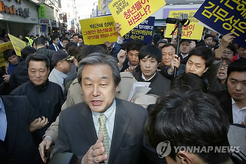 | △ 피켓 시위와 김무성 대표 (서울=연합뉴스) 이상학 기자 = 새누리당 김무성 대표가 23일 오후 서울 관악구 신림동에서 청년 1인 가구 관련 타운홀 미팅을 마친 뒤 차량으로 이동하고 있다. 뒤쪽은 고시촌 방문에 반대하는 한국청년연대 회원들과 관악 고시촌 1인 청년들이 피켓 시위를 하고 있다. |