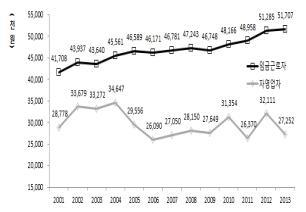 한경연이 2001∼2013년 통계청 경제활동인구조사·가계동향조사 자료를 토대로 연령대별 소득 및 고용 현황을 분석한 결과 자영업자 평균소득은 임금근로자의 절반 수준으로 나타났다.
