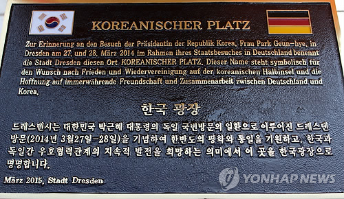 이에 따라 김 대사는 작년 9월 현지 후보지 세 곳을 답사하고 나서 행정구역명 변경 등 번잡한 절차가 따르는 '한국거리' 대신 조성 중인 공원에 '한국광장' 명명을 하기로 드레스덴 시 당국과 합의했다.