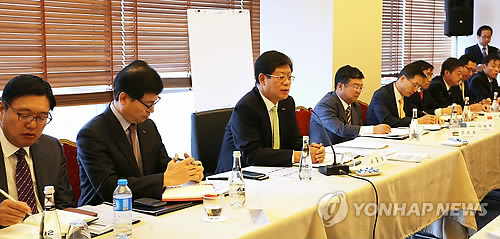 | △ 코트라, 무역관장회의 소집 (서울=연합뉴스) 김재홍 코트라 사장이 23일(현지시간) 터키 이스탄불에서 23개 코트라 중동·아프리카 지역 무역관장들이 참석하는 회의를 열고 있다. (코트라 제공) |