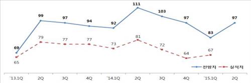 대한상공회의소(회장 박용만)가 2천428개 제조업체를 대상으로 2015년 2분기 기업경기전망지수(BSI)를 조사한 결과, 전분기(83)보다 14포인트 상승한 97로 집계됐다고 24일 밝혔다.