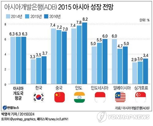 ADB는 24일 '2015 아시아 개발 전망 보고서'에서 한국의 올해 성장률이 작년 3.3%에서 올해 3.5%로 높아질 것이라고 밝혔다.