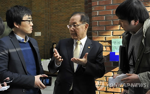 | △ 황우여 "야단 맞더라도 '이달의 스승' 사업 계속" (서울=연합뉴스) 황우여 사회부총리 겸 교육부 장관이 24일 오후 서울 서강대에서 열린 인문학 진흥 종합심포지엄에 참석한 후 기자들의 질문에 답하고 있다. |