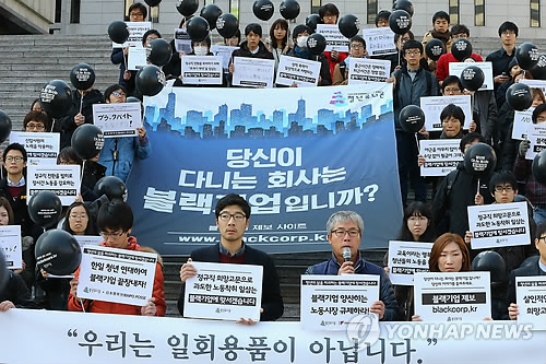 (서울=연합뉴스) 윤보람 기자 = 높은 청년 실업률과 비정규직 고용 문제를 해결하고 악덕기업을 퇴출하고자 청년단체가 이른바 '한국형 블랙기업'에 대한 자체적인 지표를 개발했다.