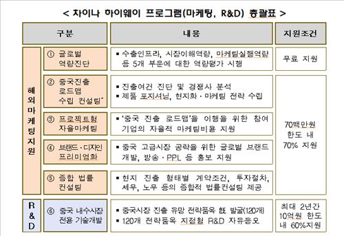 중기청은 예산을 작년보다 2배 이상 늘려 150억원을 투입해 수출 중소기업 100개 사에 중국진출 전략수립, 브랜드·디자인 마케팅, 법률 컨설팅, 기술개발 등을 지원한다. 지원대상은 연간 수출실적이 100만 달러 이상인 업체다.