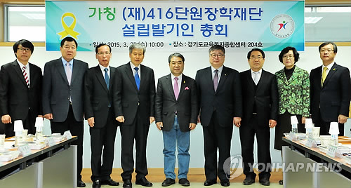 | △ 단원장학재단 발기인 총회 (수원=연합뉴스) '4·16단원장학재단 출범 설립추진단'은 25일 설립발기인 총회를 열고 '재단법인 4·16단원장학재단' 이사장으로 김태영 전 수원교육청 교육장을 선출했다. 2015.3.25 <<경기교육청 제공>> young86@yna.co.kr |
