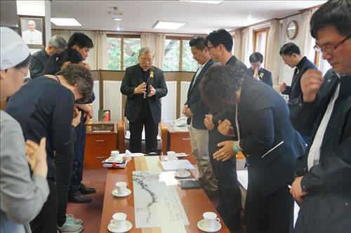 | △ 천주교 서울대교구장 염수정 추기경이 지난해 5월30일 세월호 유가족을 면담한 뒤 이들을 위해 축복기도를 바치는 모습<<천주교 서울대교구 제공>> |