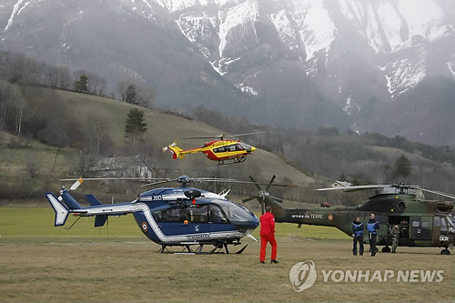 | △ 알프스 사고기 현장으로 향하는 헬기 수색팀 (AP=연합뉴스) 독일 저가항공사 저먼윙스 여객기가 추락한 프랑스 남부 알프스 산악지대 세인 레 잘프스에서 24일(현지시간) 생존자 수색팀이 헬기를 타고 눈덮인 사고 현지로 떠나고 있다. 프랑스 정부는 이날 경찰 등 수백 명의 수색팀과 헬기를 동원해 생존자 수색 등에 나섰다. bulls@yna.co.kr |