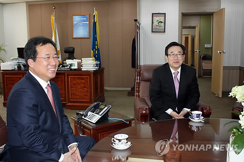 | △ (부산=연합뉴스) 민영규 기자 = 서병수 부산시장(오른쪽)과 김석준 부산시교육감이 25일 부산시교육청에서 열린 교육행정협의회에 앞서 티타임을 하며 환하게 웃고 있다. 2015.3.25 youngkyu@yna.co.kr |