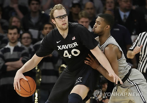 | △ 재비어대학 센터 매트 스테인브룩(왼쪽 등번호 40번)이 조지타운대학을 상대로 경기를 펼치고 있다.(AP=연합뉴스 자료사진) |