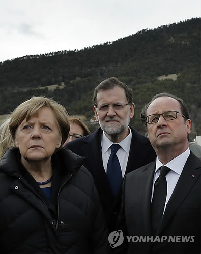 | △ (AP=연합뉴스) 앙겔라 메르켈 독일 총리(왼쪽부터), 프랑수아 올랑드 프랑스 대통령, 마리아노 라호이 스페인 총리가 25일(현지시간) 추락사고 현장을 찾아 구조작업을 지켜보고 있다. |