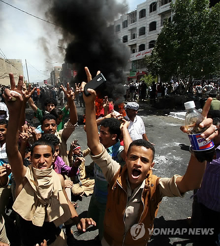 | △ (EPA=연합뉴스) 23일(현지시간) 예멘 타이즈시 주민들이 시아파 반군 후티에 항의하는 시위를 벌이고 있다. 전날 후티는 중화기를 동원해 예멘 중남부 요충지인 타이즈시의 공항, 공군기지, 법원 등 주요 시설을 장악했다. epa04676304 Yemeni protesters shout slogans and set alight tires during clashes following a protest against the Houthi takeover of several state facilities in the central city of Taiz, Yemen, 23 March 2015. According to local reports a day after Houthi rebels took over the strategic central city of Taiz, capturing several state facilities including the city's airport, airbase and a court complex, residents took to the streets to protest their presence. EPA/ANIS MAHYOUB |