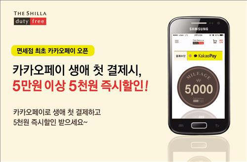 신라면세점은 카카오페이 도입을 기념, 31일까지 카카오페이를 처음 사용하는 소비자가 신라인터넷면세점에서 5만원 이상 구매하면 5천원을 할인해준다.