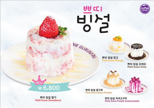 쁘띠빙설은 28일부터 석촌호수점, 명동1호점, 코엑스사거리점, 방이역점, 종로식객촌점 등 다섯 매장에서 우선 판매되고, 출시 기념으로 매장 방문 고객과 모바일앱 '퍼플멤버스' 회원은 무료·할인 쿠폰을 받을 수 있다.