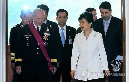 | △ 박 대통령, 뎀프시 미 합참의장 접견 (서울=연합뉴스) 이정훈 기자 = 박근혜 대통령이 26일 오후 청와대에서 마틴 뎀프시 미국 합참의장과에게 보국훈장 통일장을 수여한 뒤 접견장으로 이동하고 있다. |